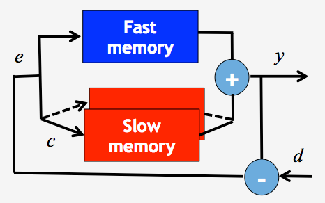 Each memory updates its state proportional to motor errors (e), which is the difference between the desired motor output (d) and the actual motor output (y). Fast memory updates its state from the current trial to the next trial faster and decays faster than slow memory. Additionally, one-fast and multiple slow memory could account for learning multiple tasks; initial interference in fast memory with gradual learning of separate representation of multiple tasks in distinct slow memory. A switching cue (c) plays a role in addressing corresponding slow memory depending on a current task.